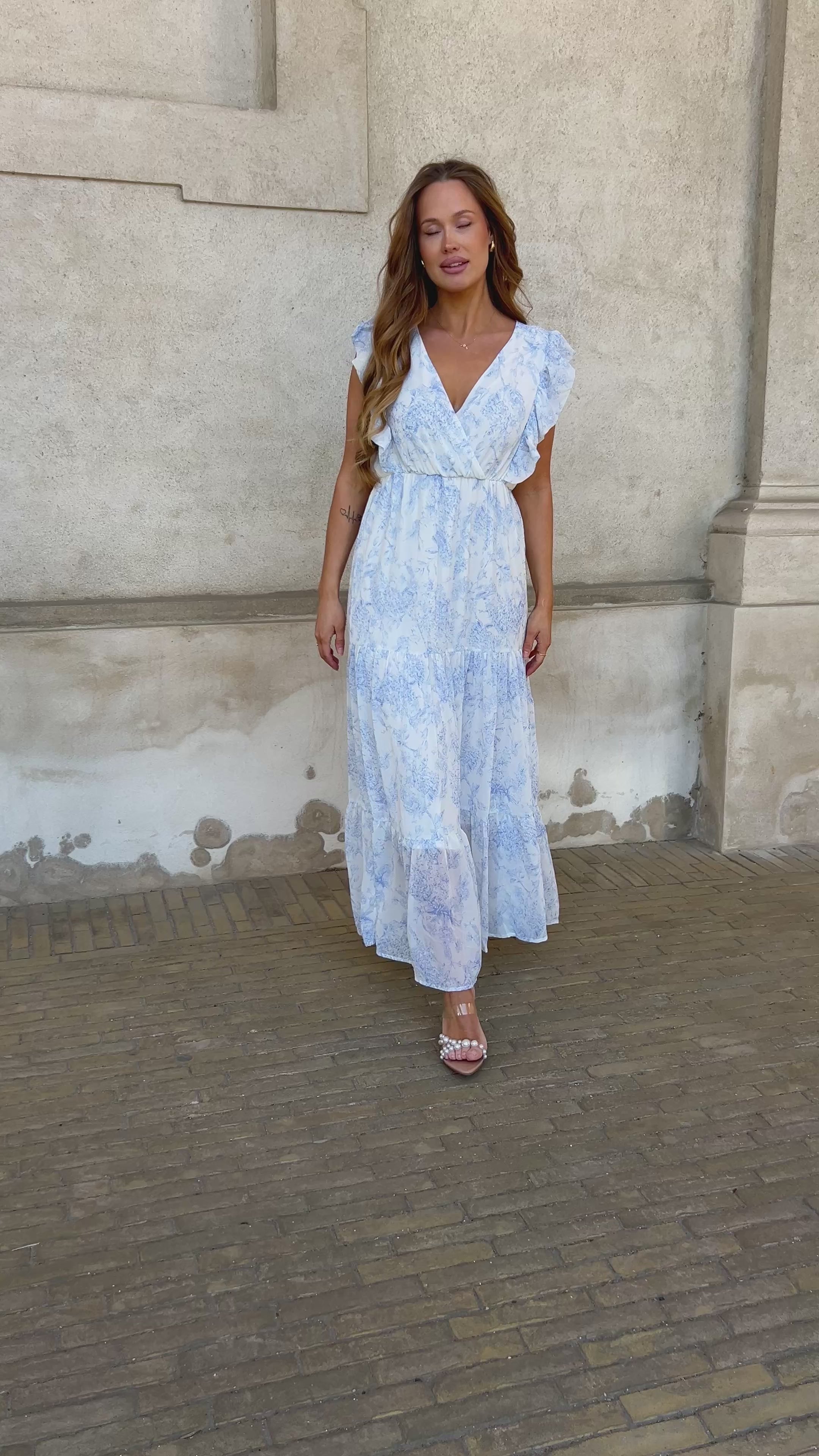 Virkelig smuk lang lyseblå kjole. Kjolen har V-udskæring, flæser på ærmerne, elastik og i taljen. Der er under stof i kjolen så den ikke er gennemsigtig.