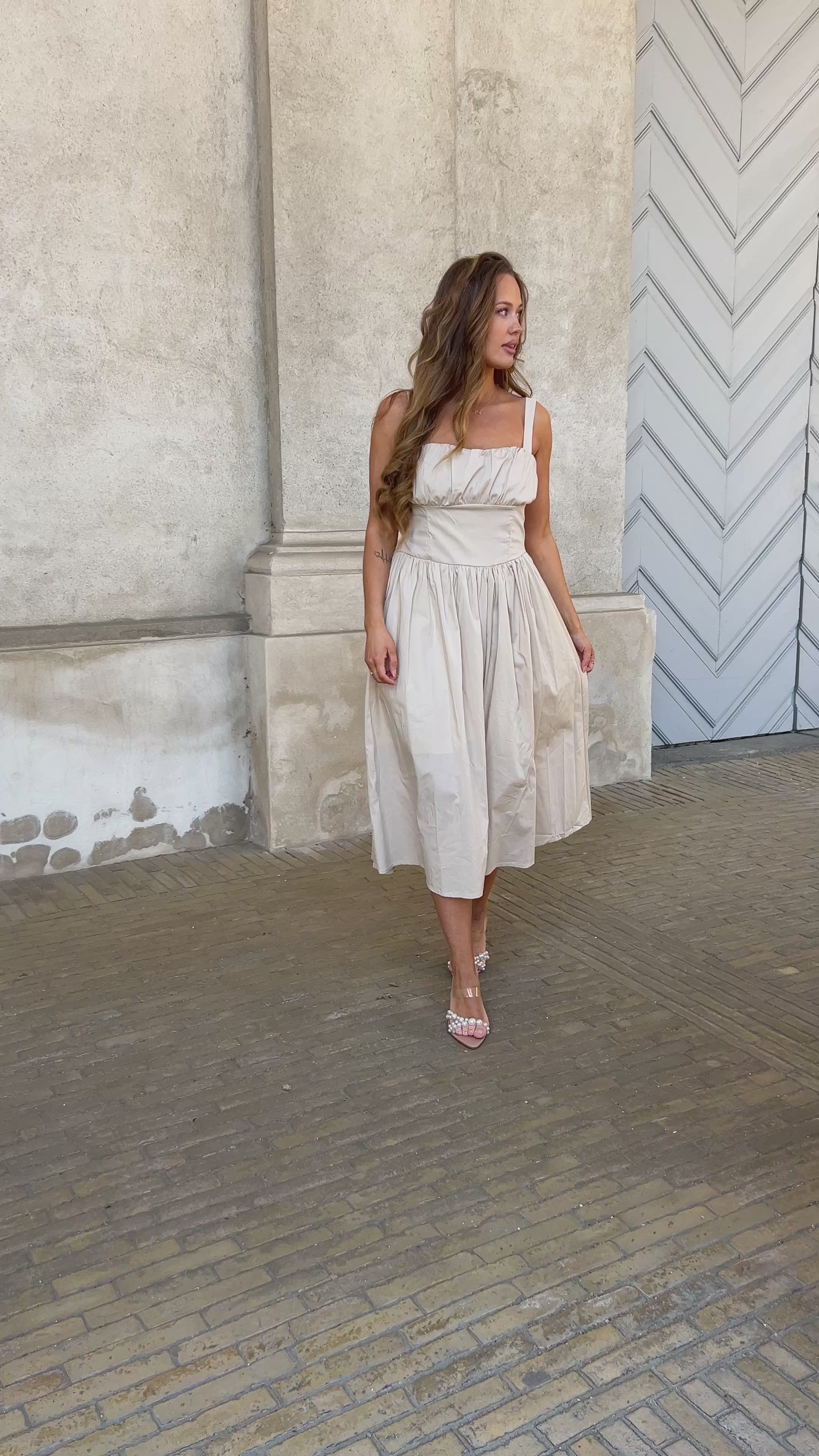 Beskrivelse: Smuk kjole i varm beige. Kjolen har tynde stropper, markeret talje, med elastin på ryggen og løst faldende skørt. Lavet i let skinnende materiale.