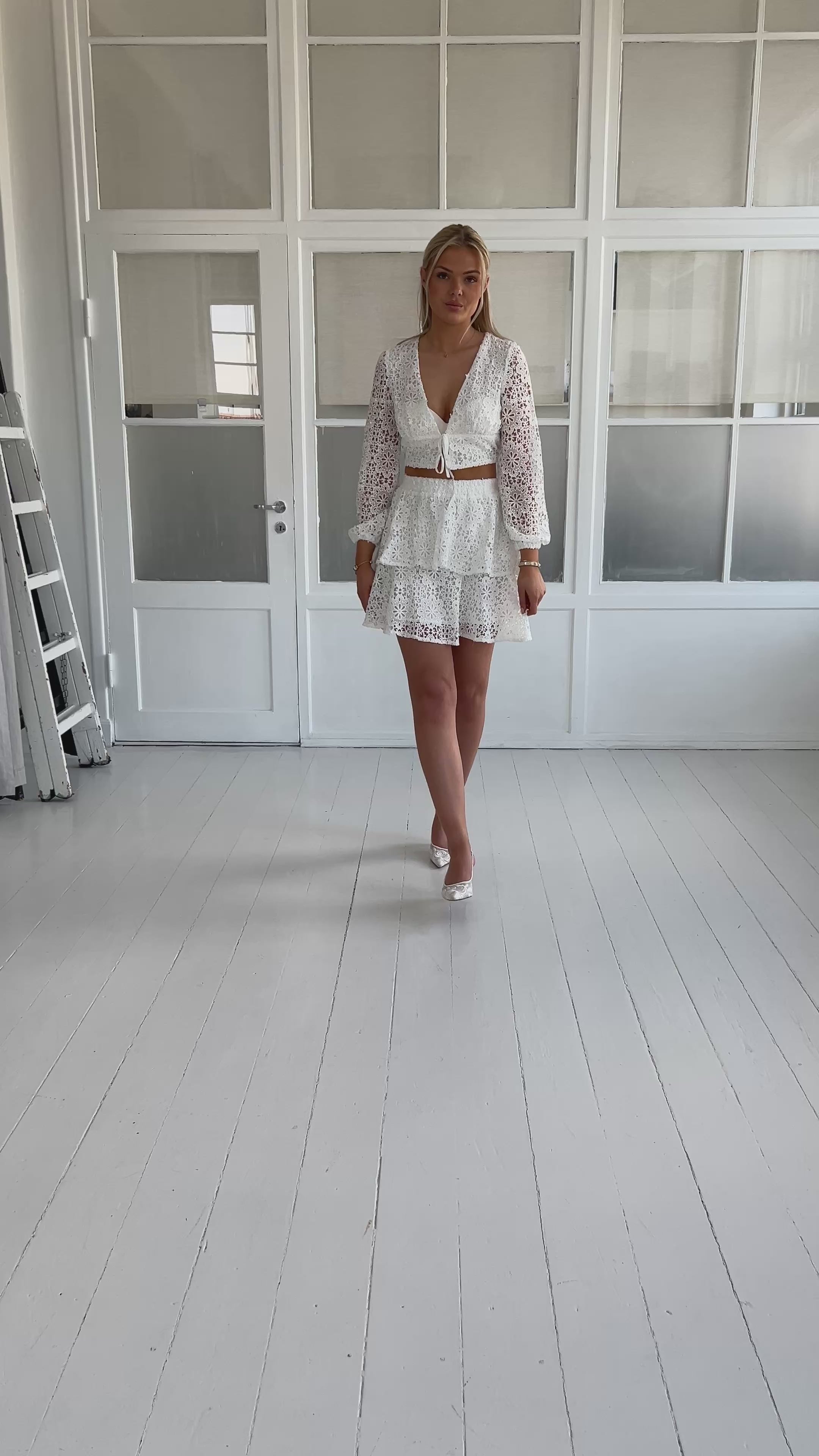 Beskrivelse: Smuk elegant hvid blonde bluse. Lange ærmer, v-udskæring og bindes foran. Den er let gennemsigte på ærmerne og lidt kort. Den passer perfekt til den matchende nederdel.