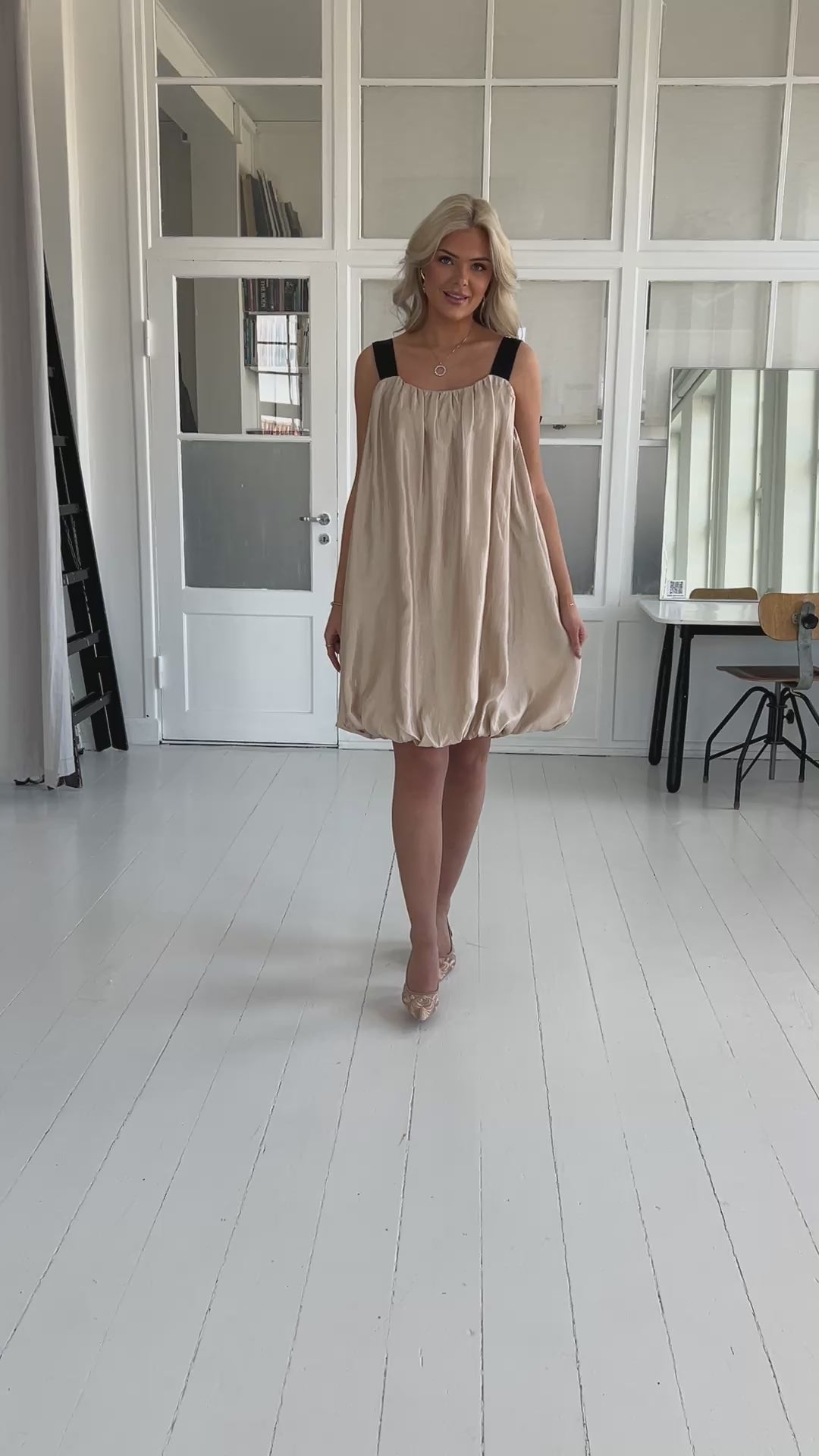 Beskrivelse: Denne kjole har et unikt design med brede, sorte stropper, med sløjfer som kan vendes både foran og bagpå, så du kan tilpasse looket. Kjolen har en luftig pasform og et let skinnende stof, der giver et elegant udtryk. Den ballonformede kjole skaber et smukt fald, perfekt til både hverdag og fest.