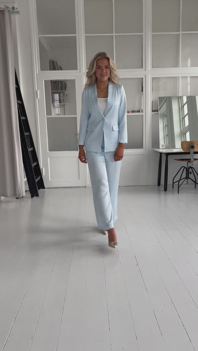 Beskrivelse: Lækre tyrkis farvet satin bukser som lukkes med knap og lynlås. Højtaljeret og lige ben.