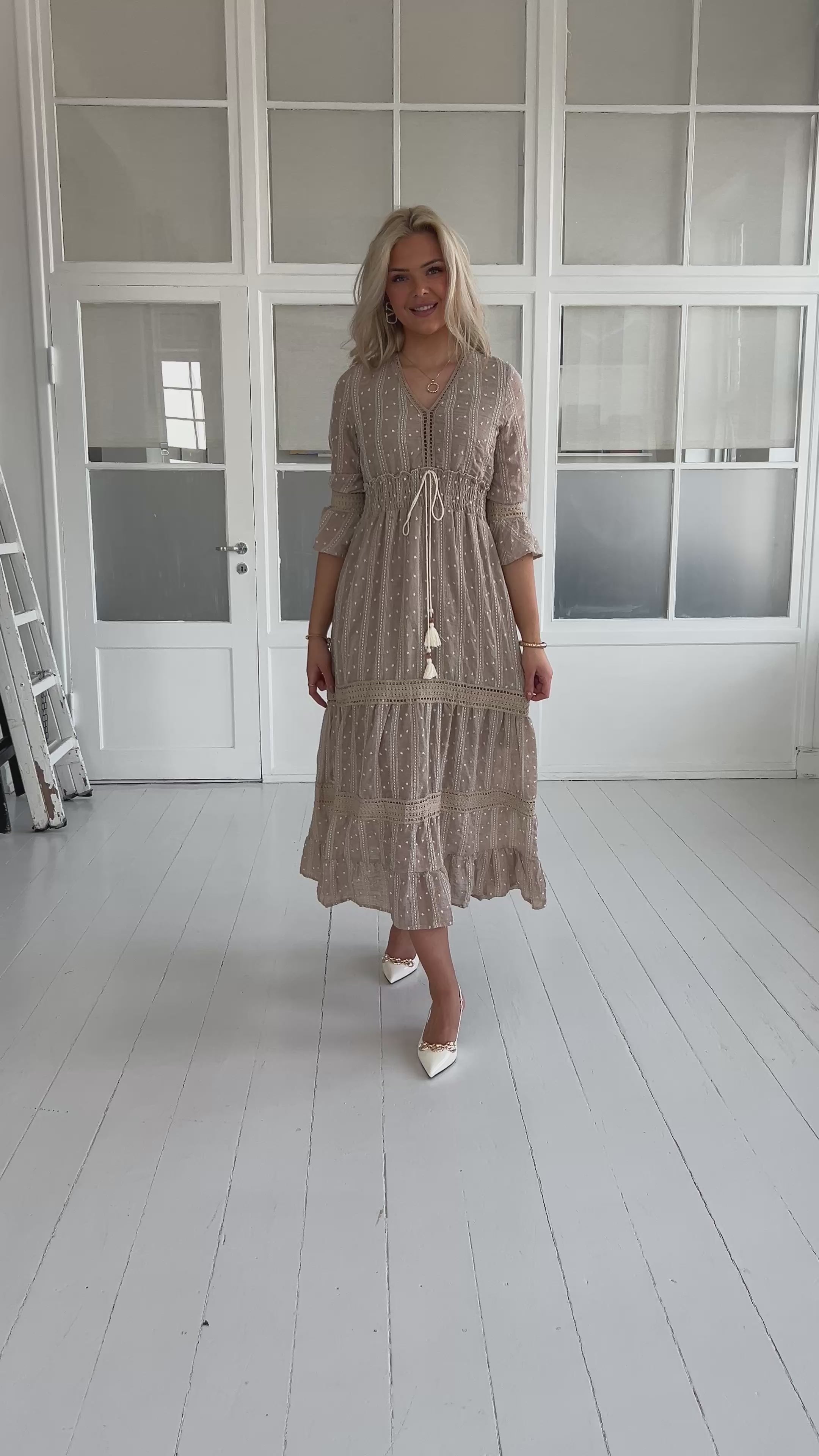 Virkelig smuk medi kjole i et lækkert blødt materiale. Kjolen har 3/4 ærmer, elastik i livet og små pynte kvaste foran. Den er lavet i et smukt lag på lag look med finde broderinger i stoffet.