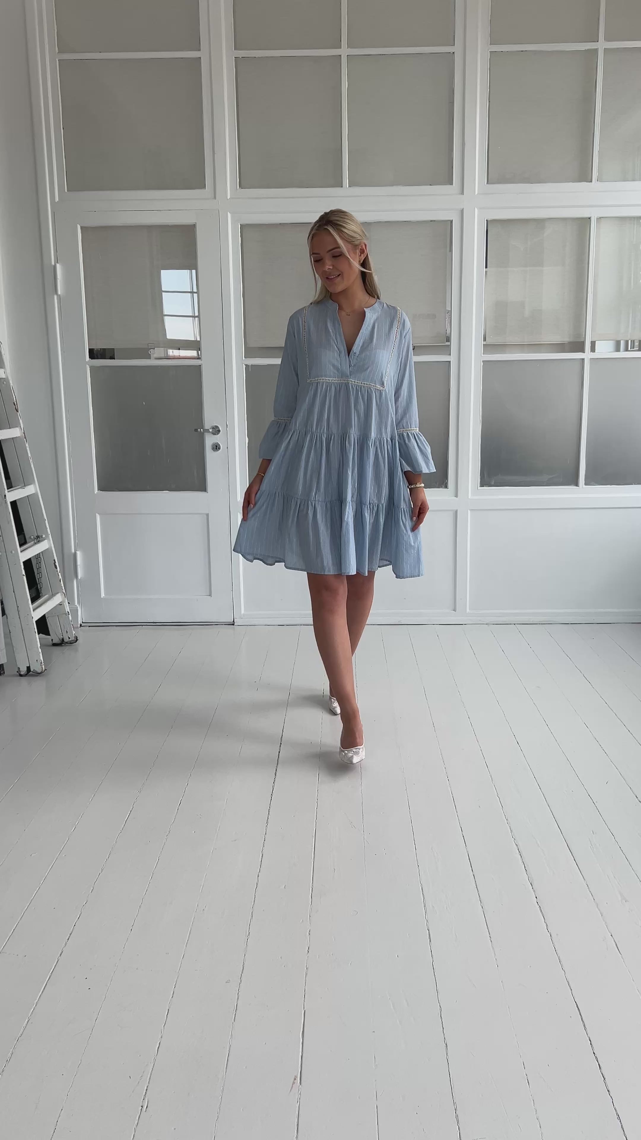 Smuk chambray maxi kjole. Kjolen har v-udskæring på front, med 1 trykknap. Bånddetaljer på bærestykket foran. Syet i flere etager, med massere af vidde i bunden.