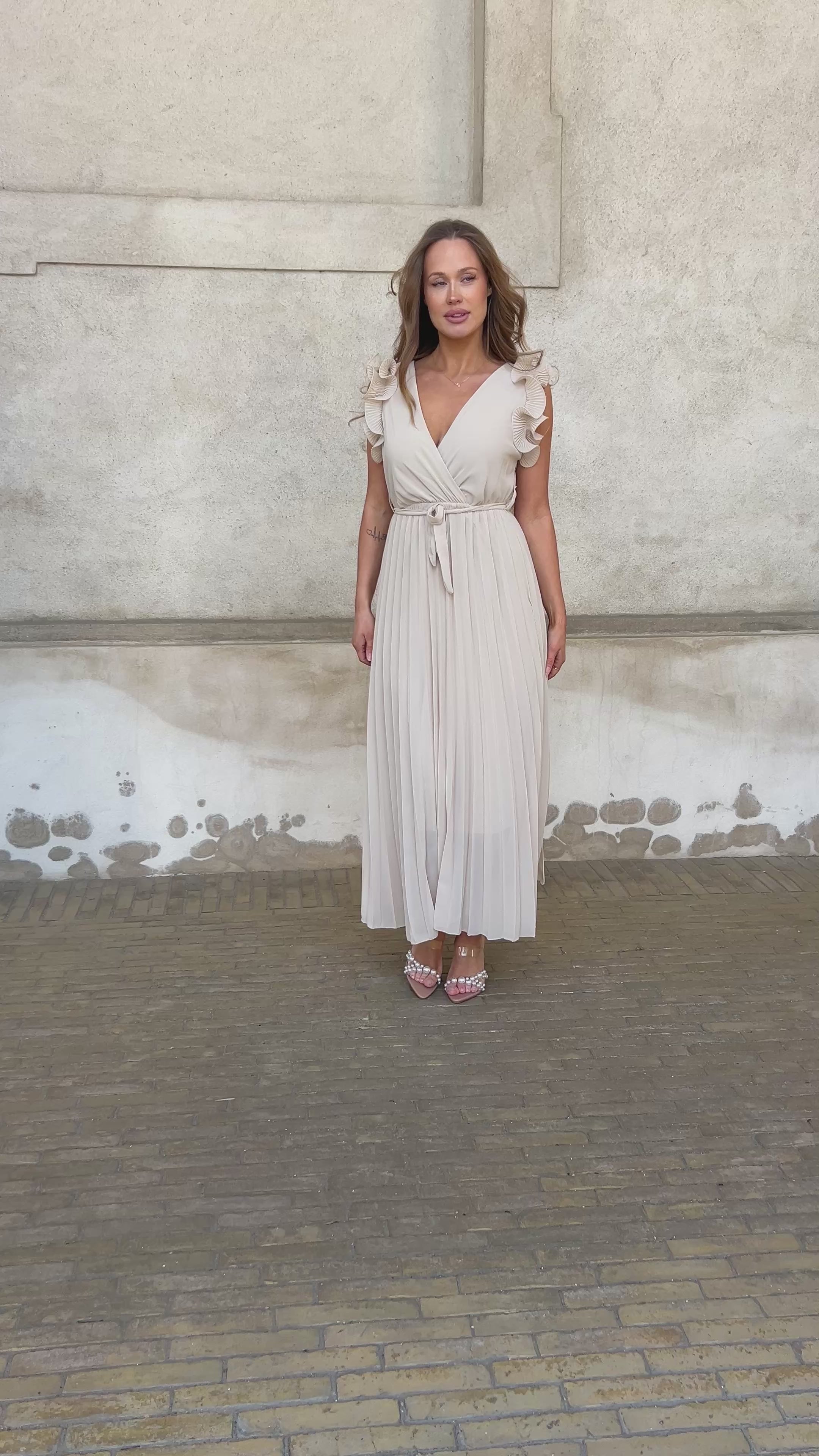 Virkelig smuk lang kjole med plisseret skørt. Kjolen har V-udskæring, flæser på ærmerne, elastik og bindbånd i taljen. Der er under stof i kjolen så den ikke er gennemsigtig.