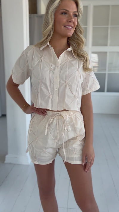 Super fine beige shorts med pyntesnørre og detaljer. Shortsene har elastik i taljen. Der findes en matchende bluse til shortsene.