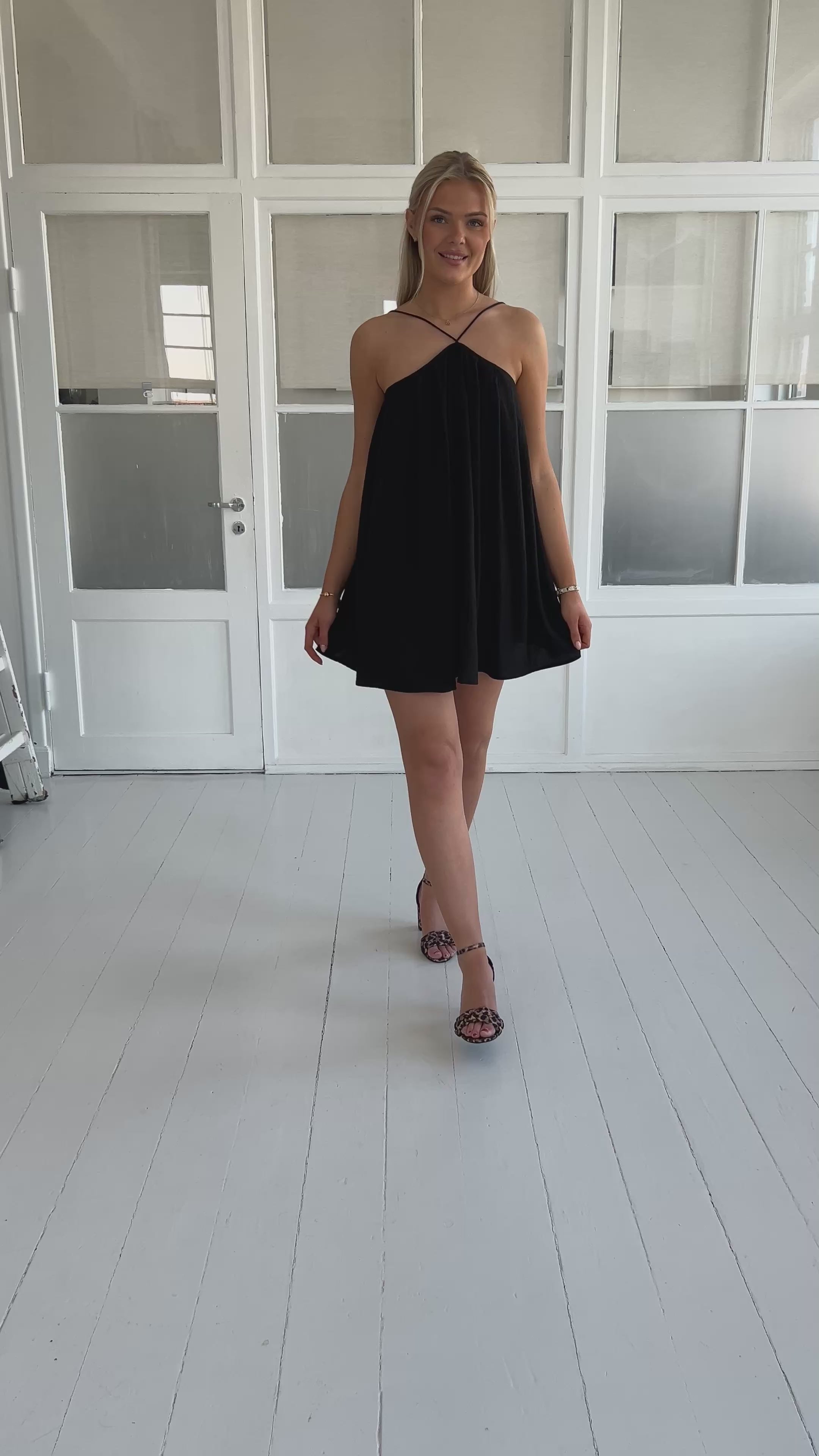 Beskrivelse: Super smuk og feminin løs sommerkjole. Kjolen har åben ryg med snører som kan justeres. Der er underkjole, ikke gennemsigtig. Der er lidt stræk i materialet.