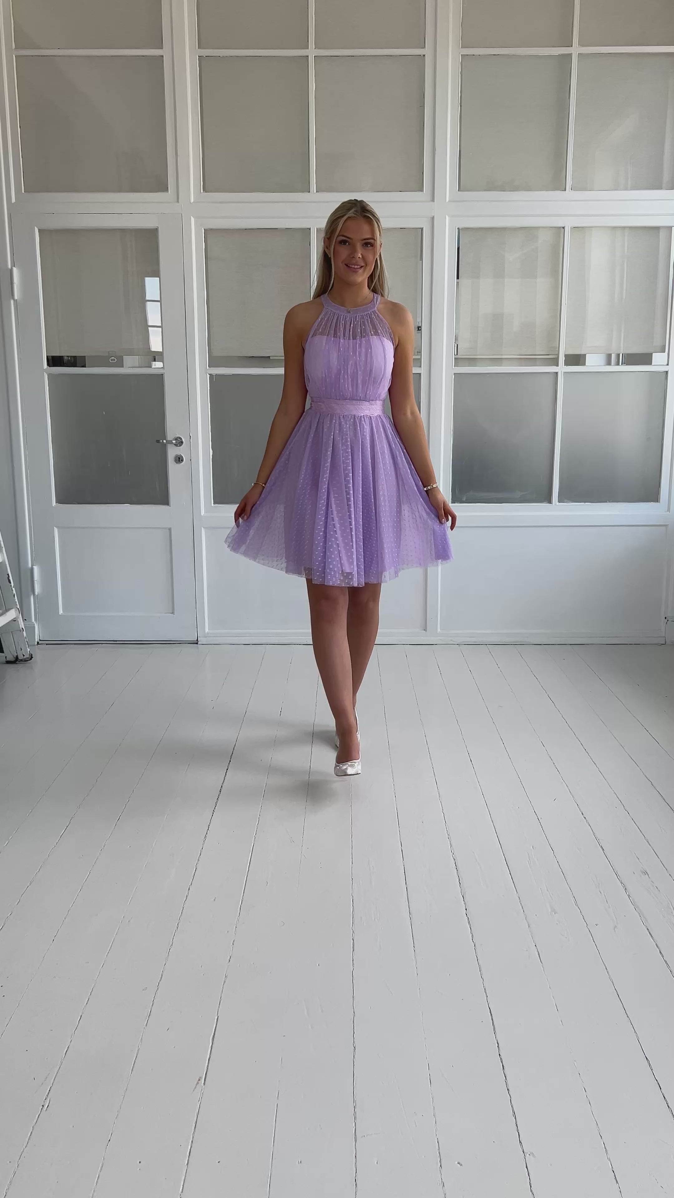 Beskrivelse: Super smuk og feminin midi lilla kjole med tyl, og mange smukke detaljer,. Lynes på ryggen og knap i nakken. Underkjole.